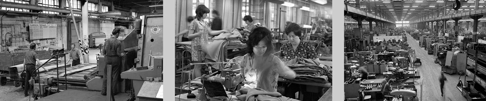 Links: Blick in die Werkstatt der VEB Holzveredelung am Blockdammweg in Lichtenberg, 1978; Mitte: Der Bereich Hosenherstellung im VEB Kombinat Oberbekleidung Berlin, Betriebsteil "Fortschritt" an der Möllendorffstraße in Lichtenberg, 1974; Rechts: Produktionshalle der VEB Werkzeugmaschinenfabrik an der Leninallee in Marzahn, 1974; Quelle: Landesarchiv Berlin, F Rep. 290-02-23 Nr. 1004, 1005, 1006, Fotografen: Vera und Dieter Breitenborn